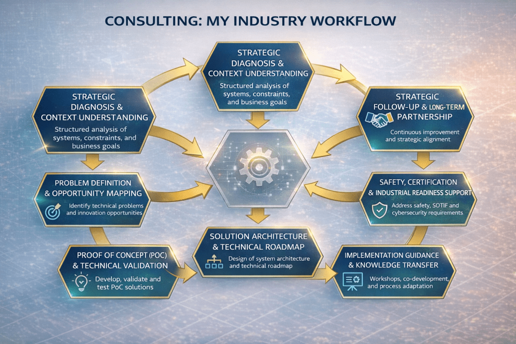 My consulting approach for industry is engineering-driven, system-level, and results-oriented, designed to bridge the gap between advanced research, industrial constraints, and deployable solutions. Rather than offering generic advisory services, I work closely with technical, managerial, and executive teams to diagnose real system problems, co-design solutions, and guide implementation in compliance with industrial standards, safety regulations, and business objectives.
