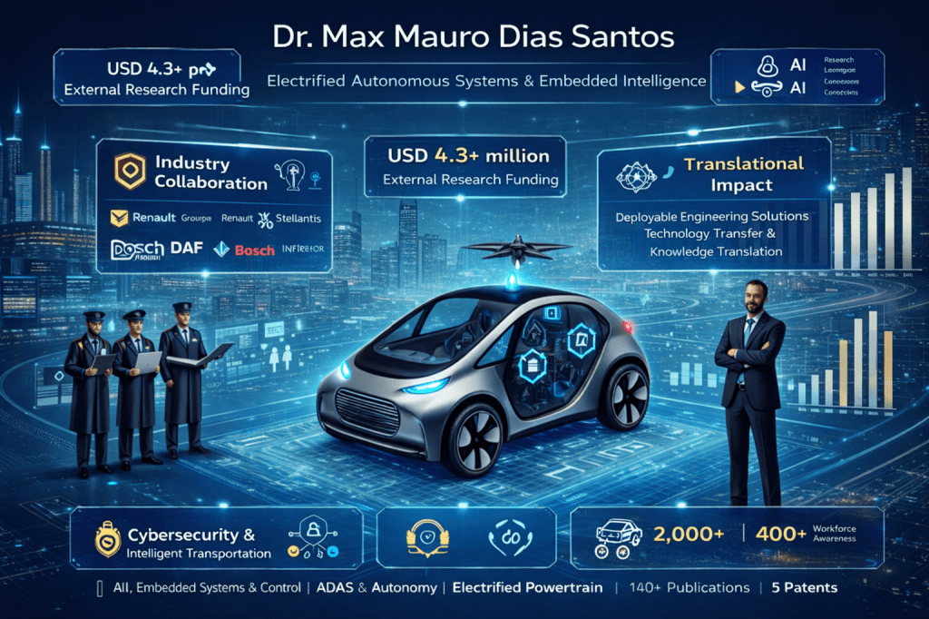 Looking forward, Dr. Dias Santos’s vision is to establish and scale globally connected research ecosystems focused on embedded AI, cyber-physical security, and intelligent, energy-aware mobility, aligned with clean technology, public safety, and long-term societal impact. His work reflects a sustained commitment to technical excellence, responsible innovation, industrial relevance, and the training of highly qualified personnel, positioning him as a leading figure in the future of intelligent transportation and autonomous systems.